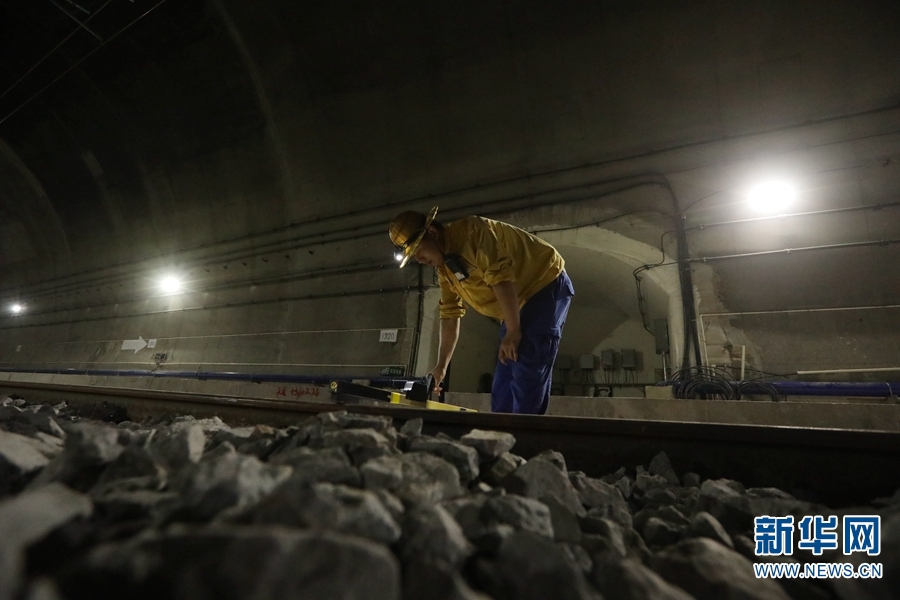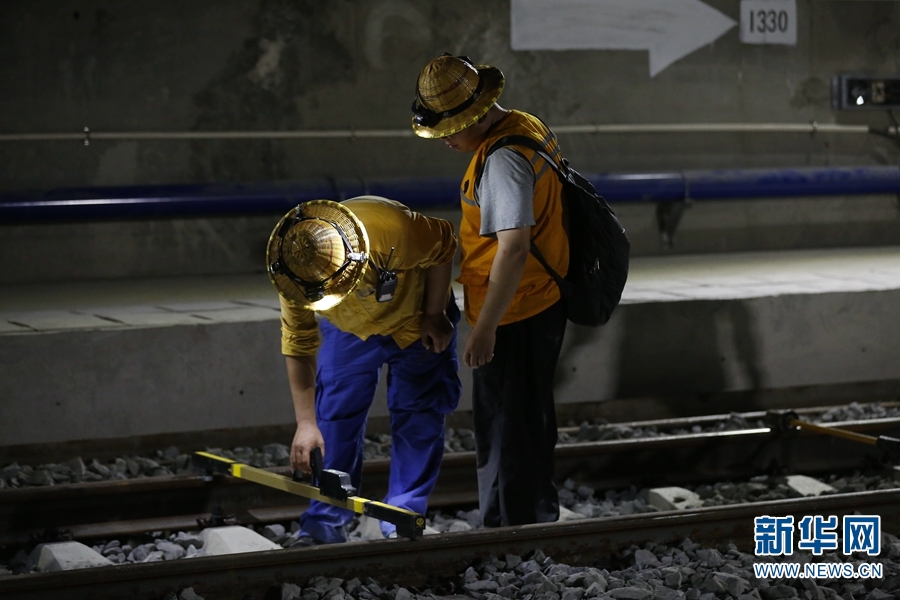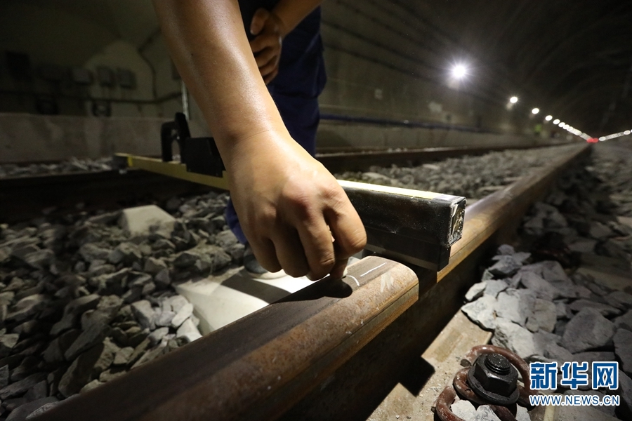 轨道精调是一项繁重而枯燥的工作,需要对每一根轨枕进行检查和测量,如果不符合标准,就要通过松螺栓、拆扣件、垫调整片等一系列措施来进行精调。图为王鹏(左)正在用道尺测量轨道的距离(摄于10月27日)。(新华网 李浩/摄)