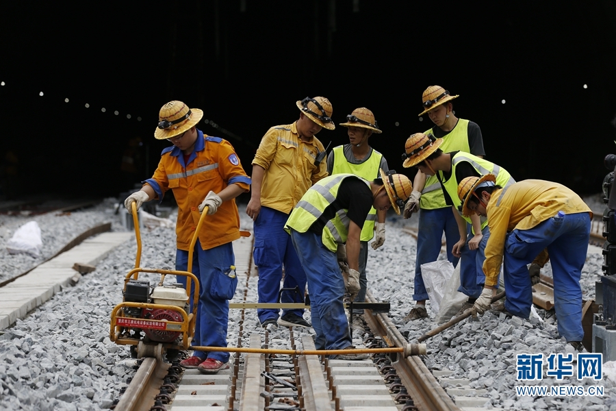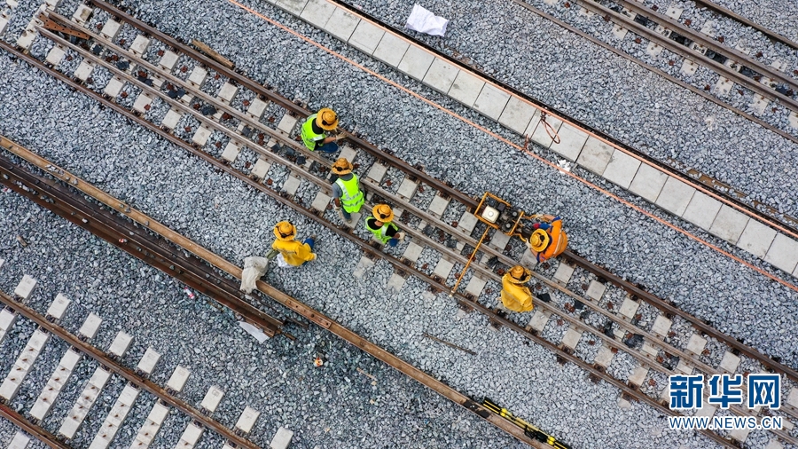 很多人或许都不知道,新建线路铺轨完成后,是不能马上跑火车的,因为看似平顺的铁轨,其实存在一些肉眼观测不到的高低起伏,需要对轨道进行精调作业,来提升线路的平顺度,确保旅客乘坐平稳舒适。而TQI值(轨道质量指数),则是铁路行业用来衡量线路几何形态的参数,数值越小,线路平顺度越高,当然对精调作业的要求也就越高。图为王鹏(左2)和工友们正在开展轨道精调作业(摄于10月27日)。(新华网 赵普凡/摄)