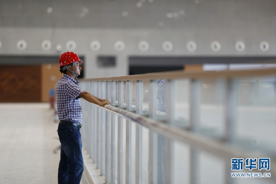 “火车站是城市的客厅,也是城市的名片。”杨学智说,作为一名铁路建设者,自己的使命,就是把站房建设得更加完美,为旅客提供舒适便捷的乘车环境。图为杨学智在普洱站候车大厅内查看施工情况(摄于10月28日)。(新华网 赵普凡/摄)