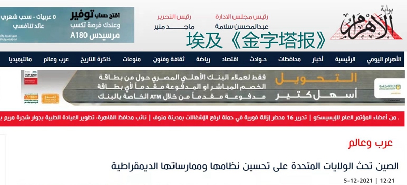 埃及官方《金字塔报》刊发题为《中国敦促美方完善民主制度》的报道,认为中国外交部发布的报告以事实为依据,揭露了美国民主的弊端以及美国对外输出民主模式带来的危害及后果。中国外交部强调民主是全人类的共同价值观,是所有国家的权利而不是少数人的特权,且民主有多种形式。