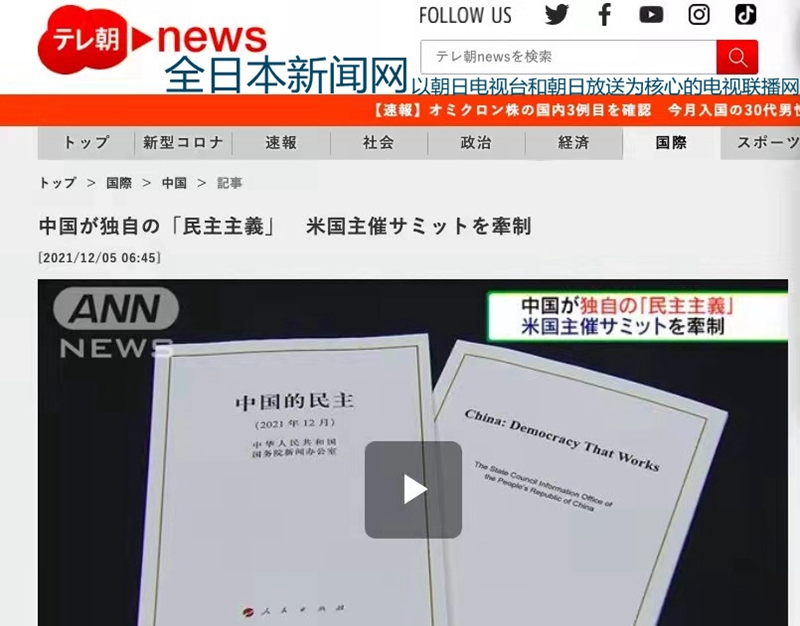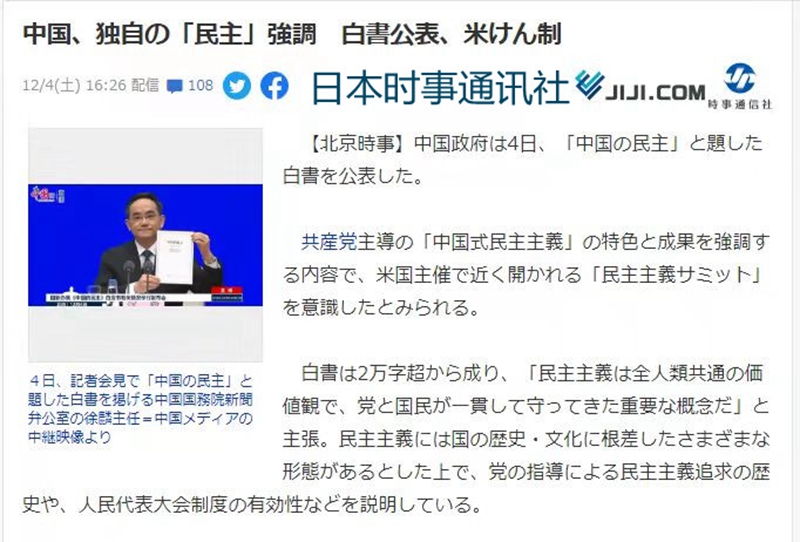 日本《朝日新闻》在报道中国国务院新闻办公室发布《中国的民主》白皮书时,援引了国新办主任徐麟在发布会上对美国的批评:“个别国家打着民主旗号在世界上煽动对抗与分裂,加剧国际紧张局势”,白皮书的作用是在美国召开民主峰会之前向世界介绍中国“全过程民主”的概念,强调中国有适合自身国情的民主制度。
