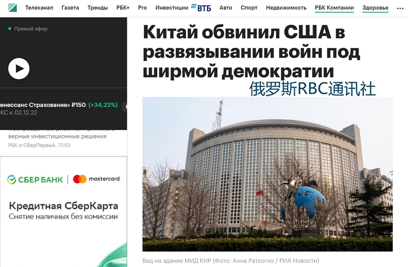 俄罗斯RBC通讯社题为《中国指责美国打着民主的幌子发动战争》的文章着重提到美国对外输出民主造成动荡和灾难,文中援引《美国民主情况》报告的内容:美国无视自身民主制度的结构性缺陷与国内民主实践的不足,自诩为“民主样板”,频频打着民主的旗号肆意干涉他国内政、发动对外战争,引发地区动荡和人道主义灾难。中国外交部认为,用单一的标尺衡量、或用单一视角看待不同的政治制度,本身就是错误。