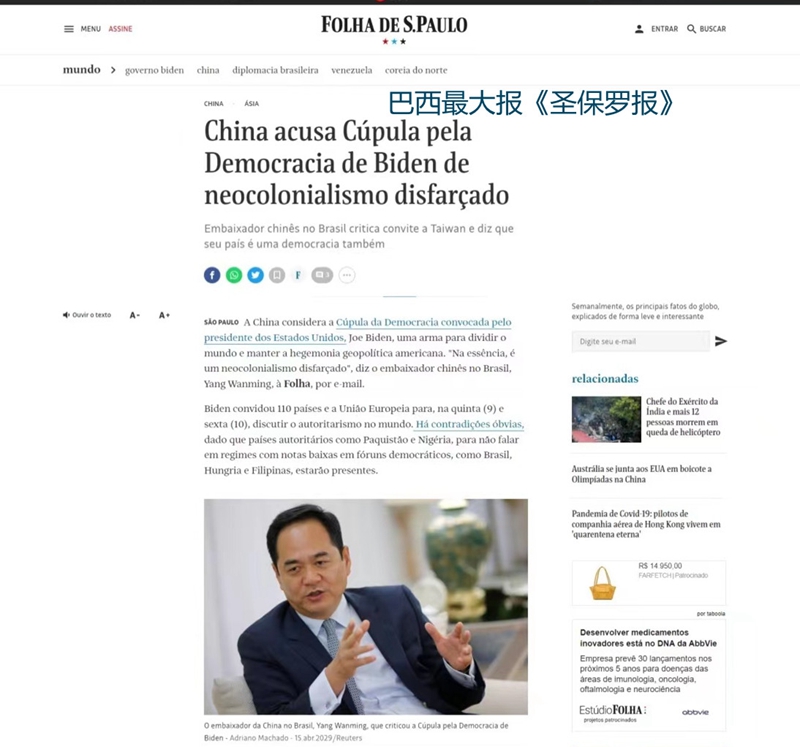 巴西最大报《圣保罗报》刊登了中国驻巴西大使杨万明的专访,认为拜登的“民主峰会”是被粉饰的新殖民主义。杨万明说:美国以“民主领袖”自居,根据自己的好恶决定谁能参会、定义谁是“民主国家”,这本身就是反民主的,打着民主旗号在全球划分阵营、制造分裂、遏制打压他国、维护自身霸权,这实质上是披着“民主”外衣的新殖民主义。