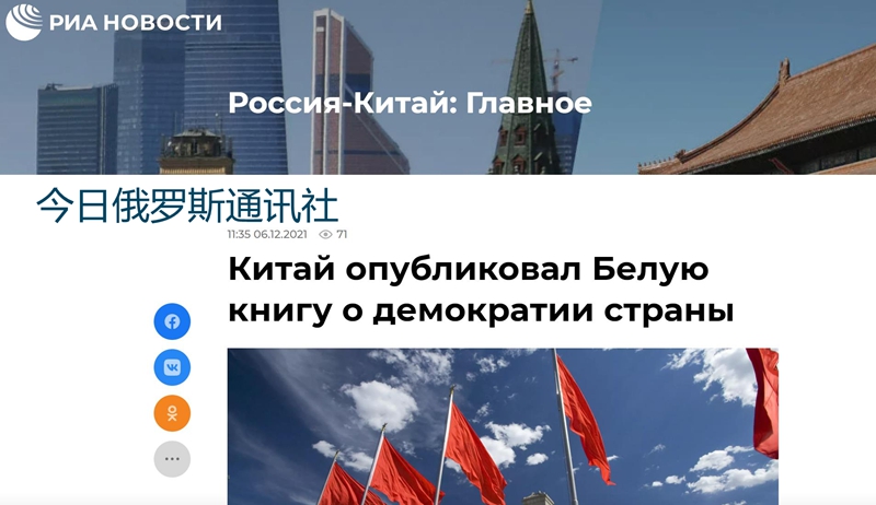 今日俄罗斯通讯社题为《中国发布关于本国民主的白皮书》的报道提到,中国民主的本质是人民当家作主。报道援引《中国的民主》白皮书说,民主是全人类的共同价值,是中国共产党和中国人民始终不渝坚持的重要理念。100年来,党高举人民民主旗帜,领导中国人民实现了人民当家作主,中国人民真正成为国家、社会和自己命运的主人。