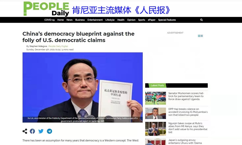 肯尼亚主流媒体《人民报》发表学者恩德格瓦评论文章,高度评价近日发布的《中国的民主》白皮书和《十问美国民主》报告,赞扬中国的民主是真实的民主,中国共产党总结历史经验,将民主等概念具体化、中国化,是世界上最具远见的政党,在较短的时间内带领中国走向伟大。中国的民主由人民创造、为人民服务,中国共产党始终密切同人民群众的联系,凝聚起最广大人民的智慧和力量。美式民主实则沦为侵犯人权、维护霸权的工具。