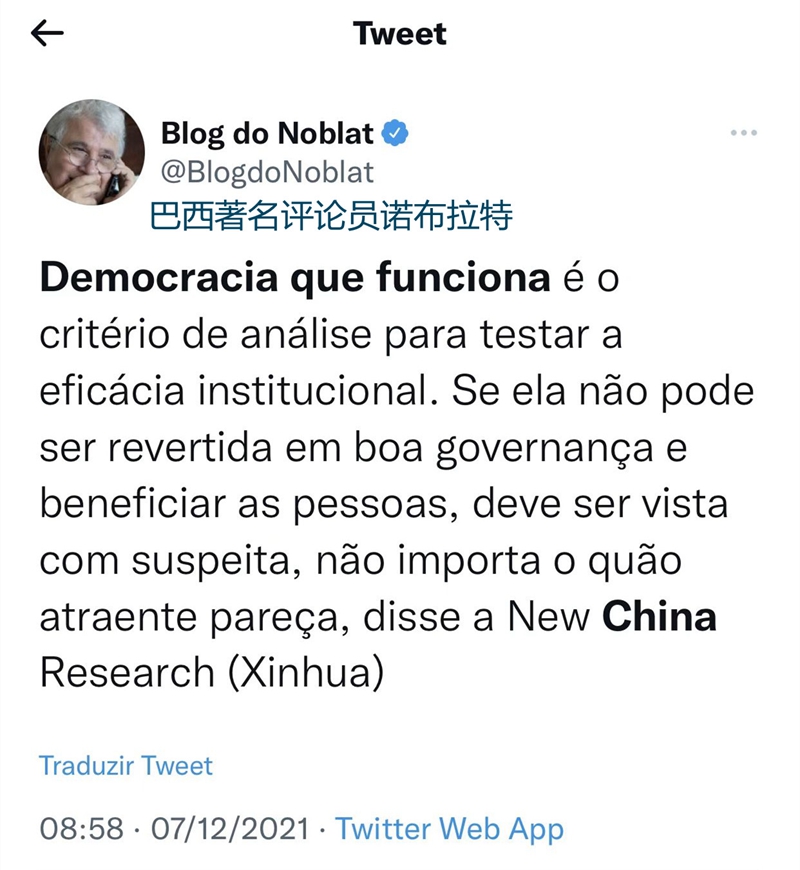 巴西著名评论员诺布拉特在个人的社交媒体账号上写道:有效的民主是检验制度有效性的标准。他援引了新华社国家高端智库《全人类共同价值的追求与探索》报告说,如果这种民主不能变成善治、造福人民,无论它多么有吸引力,都应该被怀疑。有网友在这条推特下留言说:“不幸的是,当今只有两种类型的民主:1、美国影响不了的,少数。2、美国随意操纵的,其余的。”(记者:李雪笛、柳丝、黄河、段敏夫、吴丹妮、白林、赵焱;编辑:唐志强、王丰丰、马晓燕)