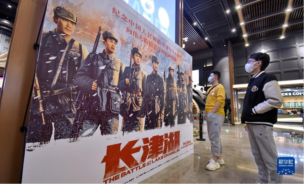 10月7日,两名年轻人在北京一家影院观看电影《长津湖》的海报。新华社记者 李欣 摄