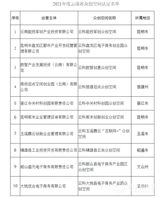 昆明信息港讯 记者戴云 12月15日,云南省科技厅发布《关于认定2021年度云南省众创空间的通知》,根据通知,10家单位认定为云南省众创空间。