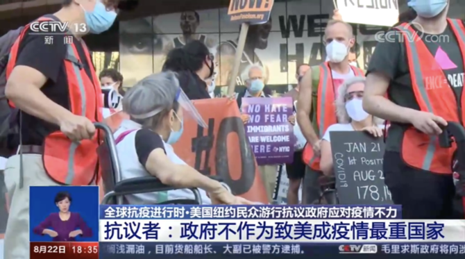 当地时间2020年8月21日,美国纽约民众游行抗议政府应对疫情不力。(图片来源:央视网)