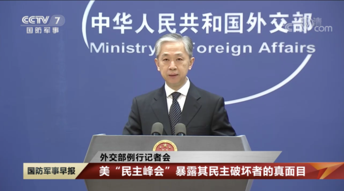 12月13日,外交部例行记者会:美“民主峰会”暴露其民主破坏者的真面目。(图片来源:央视网)