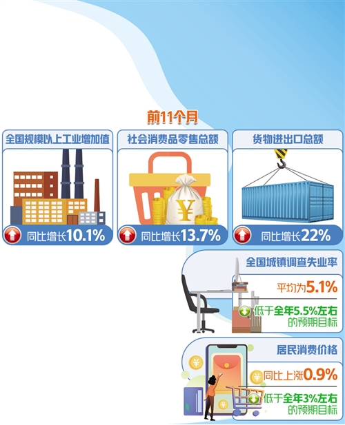 产业发展基础不断夯实。农业基础得到巩固。全年粮食产量再创新高,连续7年稳定在1.3万亿斤以上,为经济持续健康发展奠定了坚实基础。制造业得到加强。前三季度,制造业增加值占国内生产总值的比重为27.4%,同比提高1.1个百分点。1月份至10月份,规模以上制造业增加值同比增长10.4%,快于全部规模以上工业。制造业投资增长13.7%,两年平均增长4.3%,比1月份至10月份加快0.5个百分点。产业链韧性得到提升。