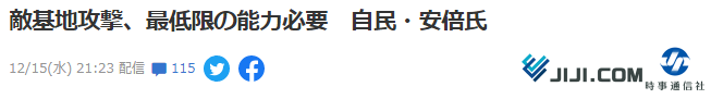 时事通讯社:安倍称需要具备最低限度访日对敌基地攻击能力