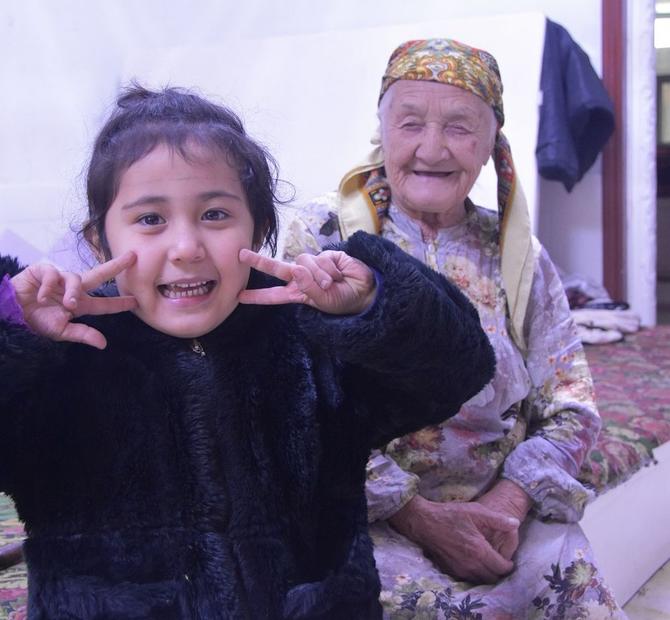 热比汗·买买提老人和重孙女(前)在一起。 新华社记者 顾煜 摄