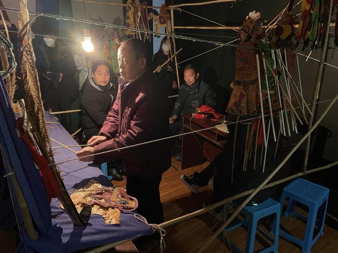 ▲三峡皮影非遗传承人何仕红和他的团队表演的皮影戏《杨家将》。记者苏畅摄