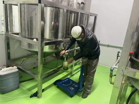 工人朱应饱查看油品情况。 下合乐寺村提供