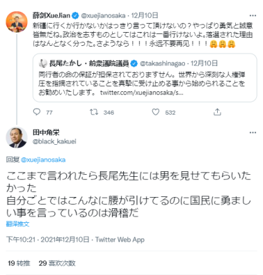 前不久,长尾又在推特上对中国驻大阪总领馆邀请日本民众访问新疆活动冷嘲热讽,遭到中国驻大阪总领事薛剑反击、“请君入瓮”。此事引发众多网友持续围观,其中不少网友对中方组织访疆活动和薛剑本人表示支持,对长尾敬提出批评。且看薛剑总领事与长尾敬的数轮交锋: