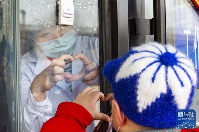 △2月11日,在哈尔滨市道外区一集中隔离点,郑莹莹和儿子顺顺隔着玻璃门“比心”。郑莹莹是黑龙江省哈尔滨市道外区人民医院一名工作人员,当时在一处集中隔离点值守。除夕上午,6岁的儿子顺顺来到隔离点,给她带来了一朵康乃馨。因疫情防控需要,母子俩隔着宾馆的玻璃门相望,完成了特殊的“除夕团圆”。