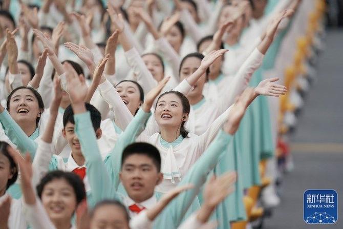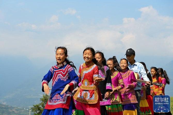 △8月6日,在四川省凉山彝族自治州普格县大槽乡,妞妞们和吉布小龙在户外唱歌。在彝族家庭里,父母一般把女儿唤作“妞妞”。在位于四川省凉山彝族自治州普格县的大槽乡中心小学,有一个全是由妞妞组成的童声合唱团——妞妞合唱团。2018年的一个课间,老师吉布小龙抱着吉他坐在操场边轻声弹唱。几个女孩循着歌声围坐了过来,跟着音乐一起小声哼唱。“你们想唱歌吗?”吉布小龙问到。女孩们没有说话,眨着眼睛,怯生生地点点头。在小龙老师的鼓励下,音乐教室里的妞妞渐渐多了起来。通过在抖音等短视频平台上的创作分享,吉布小龙让更多人看到了妞妞合唱团。2021年夏天,妞妞合唱团接到邀请,去北京参加了音乐节。妞妞们唱着歌走出大山,走向更大的舞台。
