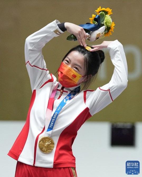 △7月24日,杨倩在东京奥运会射击女子10米气步枪颁奖仪式上“比心”。
