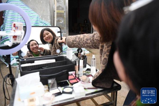 △11月17日,周文娟(右)为湖南省永州市零陵区和谐村村民蒋冬娥照镜子。2007年,从小就特别爱美的周文娟只身前往北京学习化妆。2012年,她学成回到永州,此后一直从事美妆相关的工作。2020年春节,受新冠肺炎疫情的影响,复工较晚,一直在老家的周文娟终于将想法变成了现实。她为村里的阿姨们免费化妆,并用视频记录阿姨们妆前妆后的变化。令她意想不到的是,视频发到网上后,在多个社交媒体平台登上热搜。之后,不少附近的年轻人找到周文娟,希望她也能为自己留守农村的母亲带来化妆初体验。