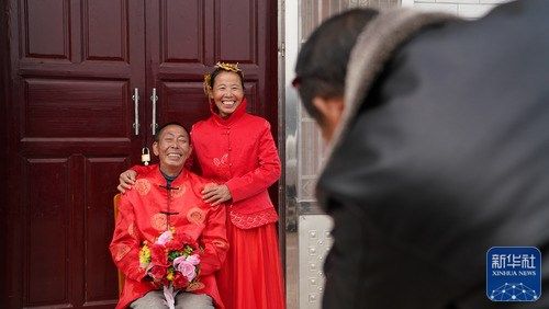 △1月22日,刘仁香和丈夫赖际林穿上中式礼服拍照。刘仁香所在的江西省万安县夏造镇横江村曾是贫困县的贫困村。2020年,村里最后2户贫困户顺利脱贫。2021年农历新年来临之际,为了给脱贫摘帽的百姓带去特殊的问候,当地政府特意邀请摄影师,为20多对从未拍过婚纱照的夫妻免费上门补拍婚纱照。