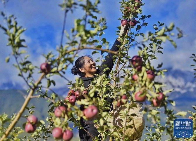 △10月20日,村民在四川省甘孜藏族自治州乡城县青德镇万亩果园里采摘苹果。