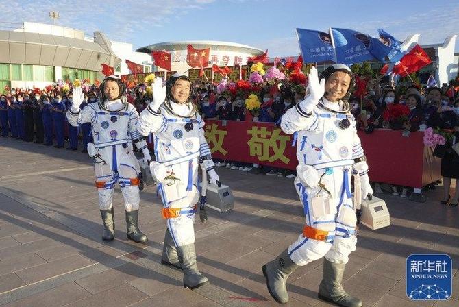 △6月17日,神舟十二号航天员出征仪式在酒泉卫星发射中心举行。这是航天员聂海胜(右)、刘伯明(中)和汤洪波在出征仪式上挥手。