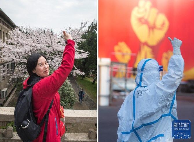 △拼版照片:左图为2021年3月13日,周国红在武汉大学樱花树前拍照留念。右图为2020年2月12日,周国红在武汉体育中心方舱医院前竖起拇指为自己和同伴加油。2020年春天,作为安徽援鄂医疗队的一名队员,周国红奔赴武汉,用生命守护生命。2021年的春天,她再次来到武汉,参加武汉大学举办的援鄂抗疫医护人员赏樱专场。珞珈山下,樱花大道如诗如画,周国红在志愿者陪伴下一路赏景,嘴角始终挂着微笑。