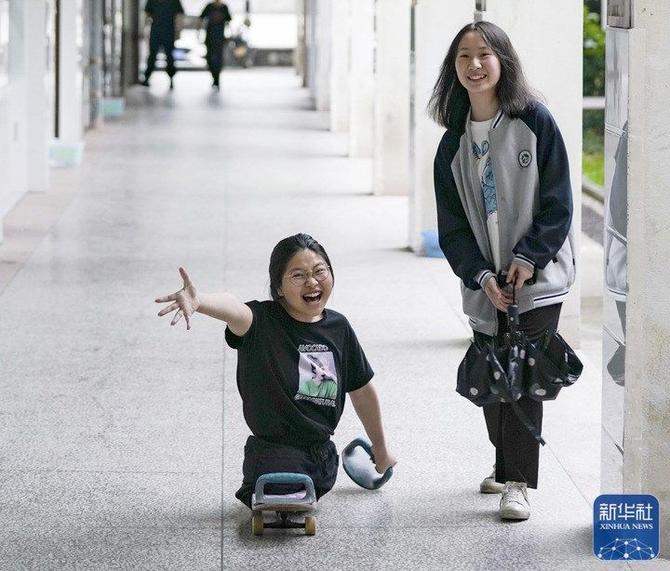△5月10日,蒋张子怡(左)和同学在学校的走廊聊天。16岁的蒋张子怡是江西上饶中学高中一年级的学生。2010年一场车祸夺去了她的双腿,如今的她只能依靠滑板代步,用双手前行,为此,大伙都称她“滑板姑娘”。身体虽然残疾了,但却没有磨灭蒋张子怡对美好生活的信念和渴望。除了每天由母亲张水香骑着电动车接送她上学读书外,她还有着广泛的兴趣爱好,喜爱舞蹈、播音主持和写作,希望可以成为一个多才多艺的人。