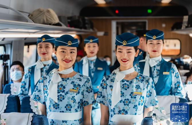 △11月26日,列车员在中老铁路媒体试乘体验列车上展示制服。当日上午,中国铁路昆明局集团有限公司昆明客运段为即将开行的中老铁路而设计的列车员制服“丝路花语”首次亮相。