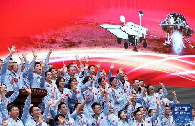 △5月15日,航天科研人员在北京航天飞行控制中心指挥大厅庆祝我国首次火星探测任务着陆火星成功。