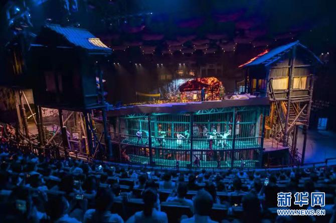 图为大型红色舞台剧《重庆 1949》演出现场。由5个大型圆环构件而成的舞台可实现360度旋转。新华网 发