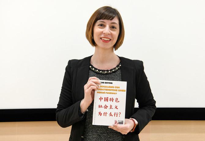 乐小悦轻轻拿出一本白色封面的书,上面赫然印着意大利文和中文的书名《中国特色社会主义为什么行?》。书的译者,就是乐小悦。