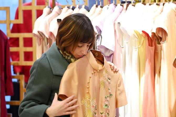 乐小悦在老美华旗舰店内选购旗袍(12月3日摄)。新华每日电讯记者李然摄