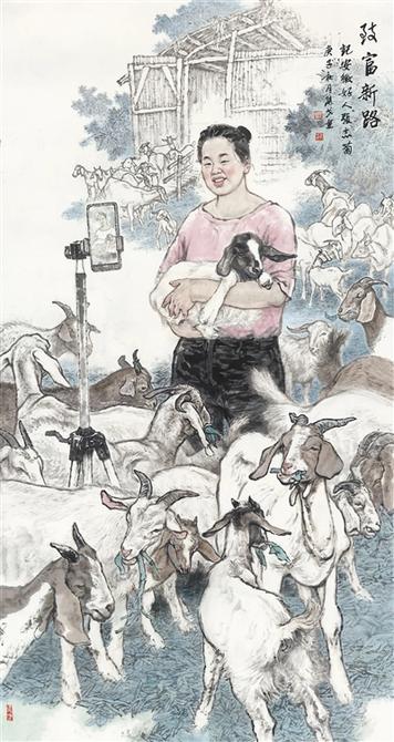 互联网时代,就业创业形式更加多元。一些返乡创业者借助互联网平台,以新观念和新技术带动新产业发展,为乡亲们开拓稳定增收的新路径。罗小珊中国画《互联网+创业时代》便聚焦这一热潮。作品以拼贴式的构图,串联多个时空,展现不同的观察角度,呈现丰富的视觉效果。画家还大胆运用撞色手法,配色明亮而又和谐,闪耀而不张扬。充满动感的构图、笔法与色彩,展现出创业群体的自信与活力。