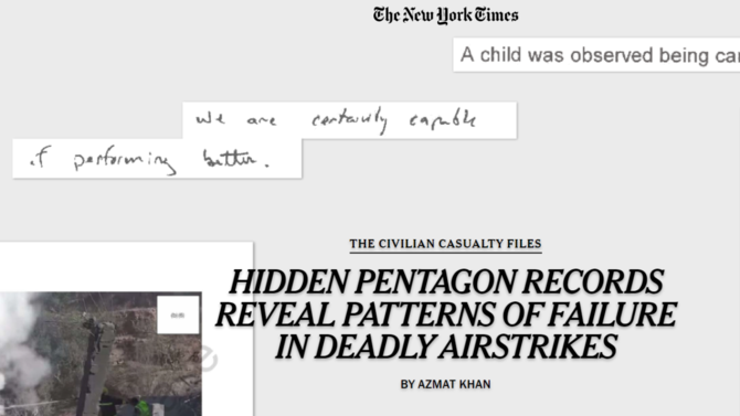 在审查文件,并走访了近百个在伊拉克、叙利亚和阿富汗的事发地后,《纽约时报》称,尽管美国军方没有走访这些地方或与目击者交谈,但他们仍然经常否认平民伤亡的报告,称这些不可信。