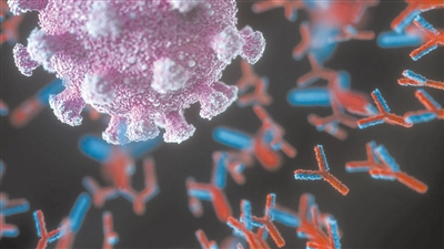 艺术家描绘的单克隆抗体(红色和蓝色)攻击新冠病毒(紫色)的概念图。