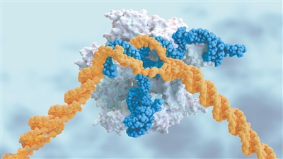 来自CRISPR注射的引导RNA(蓝色)将DNA切割酶(白色)引导至其目标(橙色)。