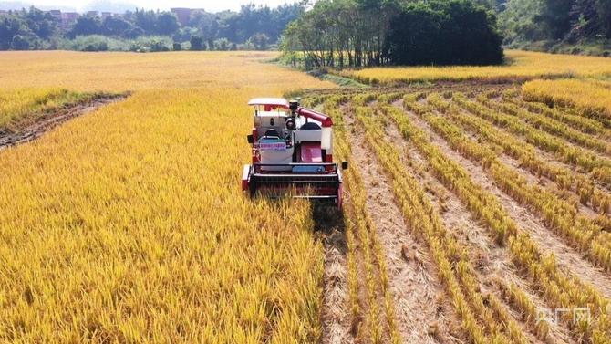 11月底,当北方已是寒风料峭冬意浓,珠三角的田间却是另一派景象:稻穗将大地染成金黄,构成了一幅绚丽的秋收画卷。