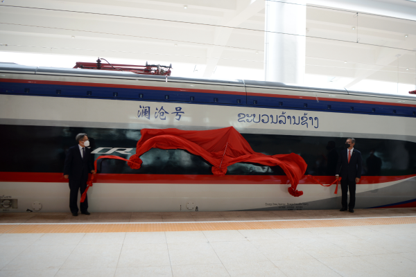 图为中老铁路“澜沧号”动车组交付仪式在万象站举行。