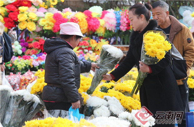 在昆明龙凤公墓,菊花、勿忘我等鲜花祭祀用品受到市民的青睐。