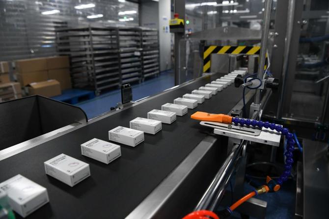 在马来西亚吉隆坡郊区的发马公司灌装工厂,工人在包装本地灌装生产的科兴疫苗(10月5日摄)。新华社记者 朱炜 摄