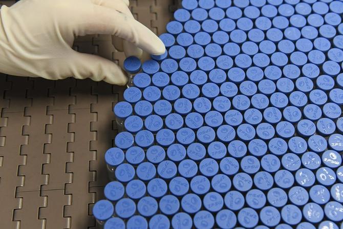 在安徽智飞龙科马生物制药有限公司新冠疫苗生产线上,工作人员将疫苗放入传送带(5月25日摄)。新华社记者 张端 摄