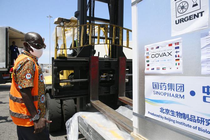 工作人员在科特迪瓦阿比让国际机场搬运中国国药集团通过“新冠疫苗实施计划”供应科特迪瓦的新冠疫苗(2021年9月18日摄)。新华社发(伊万·宋摄)