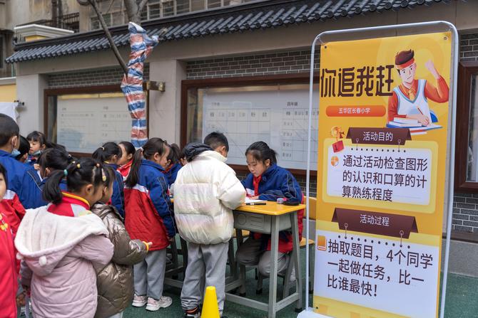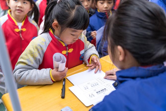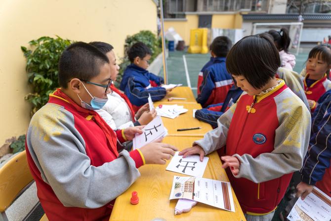 在操场上,一年级的学生们正积极参与诗词、拨钟认识时间、二十以内加减法、拼音等知识闯关,六年级的学生正在耐心地引导紧张的学弟学妹。“这个是什么字呀,冬天过了是什么季节,对啦是春。”每完成一次闯关,学长学姐们便会给盖一个章。