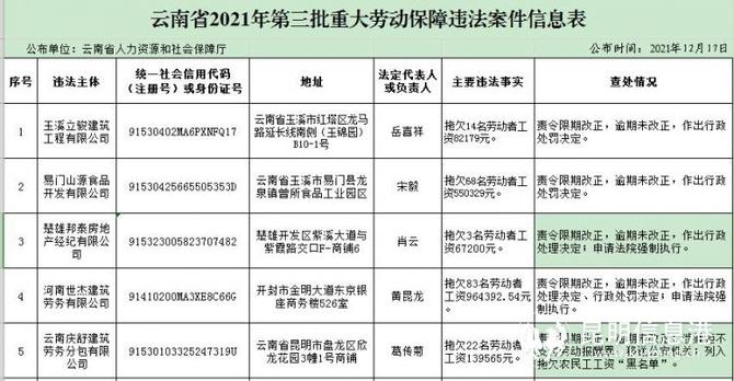 云南省人社厅公布2021年第三批重大劳动保障违法案件