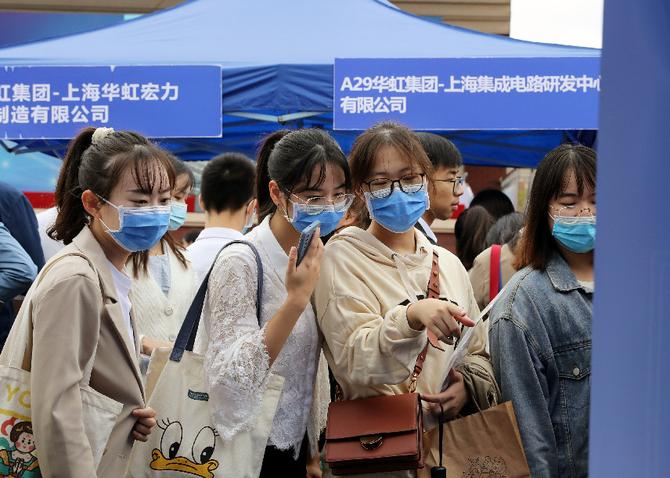 毕业生在2022届上海高校毕业生秋季校园招聘会上了解岗位信息(10月12日摄)。 新华社记者 刘颖 摄