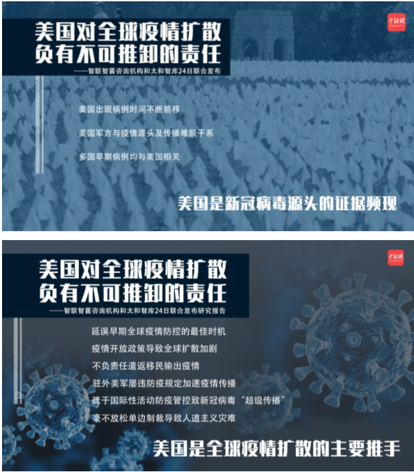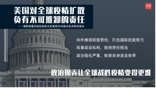 新冠肺炎疫情是一场肆虐全球的公共卫生危机,需要世界各国共同应对。但是,美国政府不仅没有承担起应负的国际责任,还对全球抗疫造成了破坏性影响。24日,智联智囊咨询机构和太和智库联合发布研究报告《美国对全球疫情扩散负有不可推卸的责任》,报告指出,多项数据和信息显示,美国才最有可能是新冠病毒的“起源国”,是导致疫情在全球快速扩散的罪魁祸首,而美国的政治化操弄更是让全球战胜疫情步履维艰,面临严重挑战。