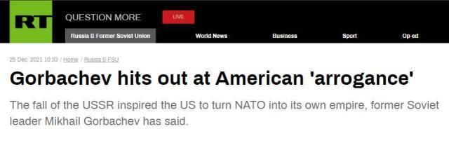 在接受俄新社采访时,戈尔巴乔夫指责美国在1991年苏联解体后变得过于自负,暗示华盛顿被“西方的必胜主义情绪”冲昏了头脑。他说道,“(美国)变得太傲慢、太自信、太自负了。他们宣布在冷战中获胜。我们将世界从对抗中拉了出来,从核竞赛中拉了出来。但相反,‘赢家’决定建立一个新的帝国。”