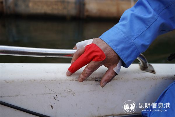 除了江面上的固体垃圾,水草腐烂也会导致水体污染。每逢水草旺盛处,李春伟必须停船,纵身跃上江面的管道,扎稳马步,挥动镰刀,割断水草,然后瞄准时机,跨回小船。行至油管桥,由于江底管道阻拦,李春伟只能停船上岸,步行6公里,沿岸打捞。不论酷暑严寒,每天至少打捞8小时,有特殊情况,不分时间、不讲条件,驻守江面。冬日里,天冷水寒,一双手反复在水中进出,长年累月,风湿性关节炎便成了他的“老朋友”。